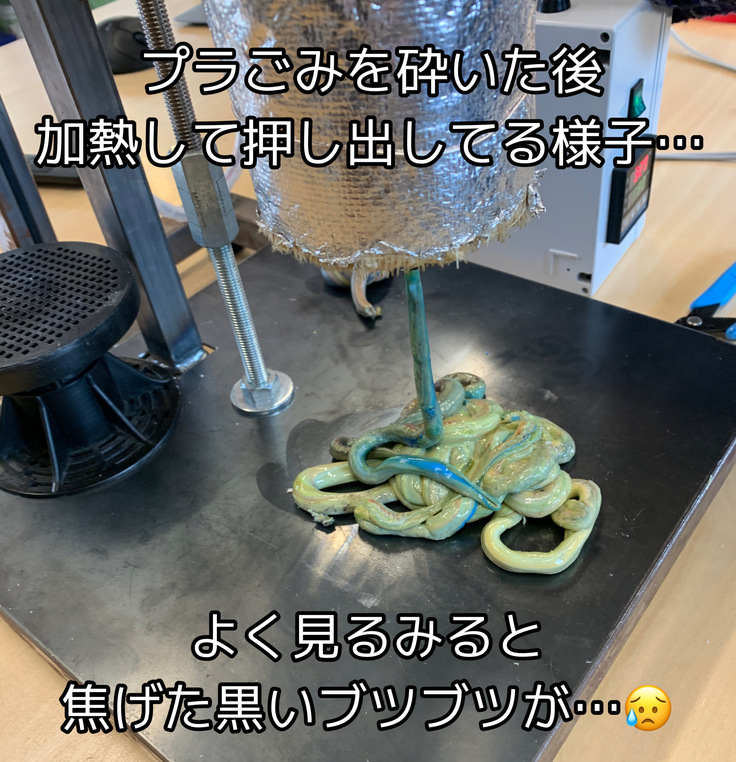 回収したプラごみの中に加熱整形できない種類のプラスチックが入っていたようで、残念ながら青色の素材は全滅しました(´;ω;`)