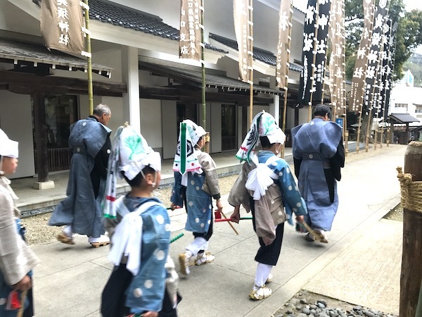 そこでの御神事にも地元の子どもたちが活躍していました。前日夜の宵宮。そして当日は特殊な装束を付けて、大人たちと一緒に町に御神事を触れ回るという大切な役でした。