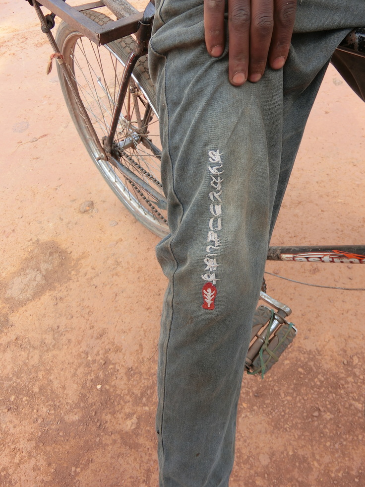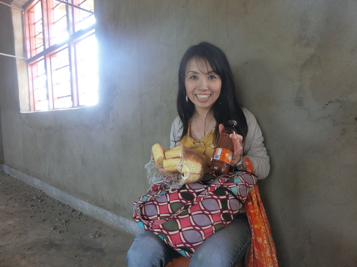 壁(左)「ありがとうございます」と書かれた不思議なジーンズ!(中央)日本語ジーンズに興奮する私に、笑顔で対応してくれたスタッフ。(右)この日のランチは、特大パン1個(写真は仲間の分5個)とジンジャージュース。パンは素朴な味で美味しい。1個100Frw(13円)。ジュースは1本53円。