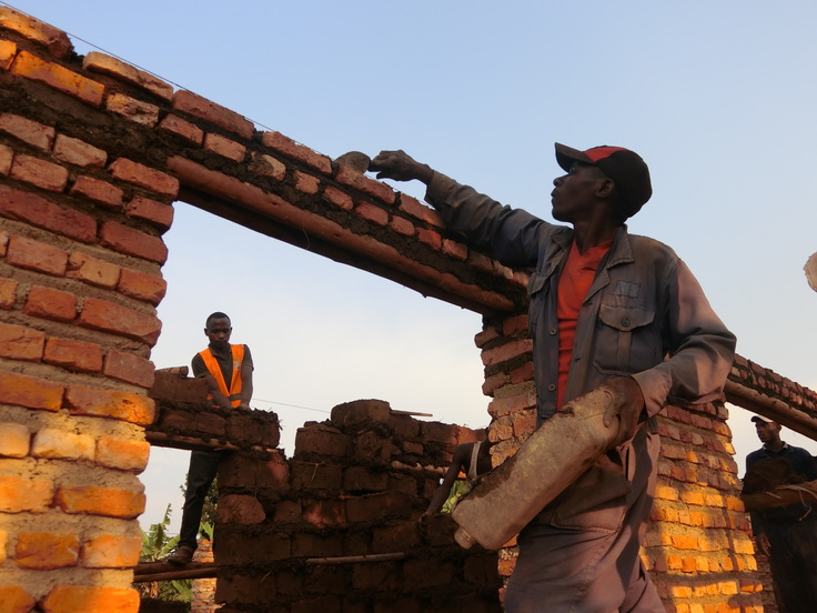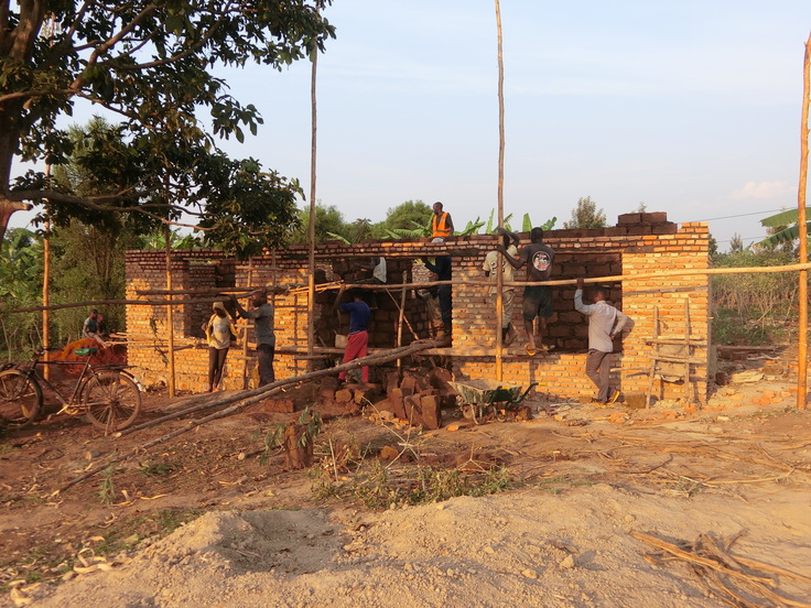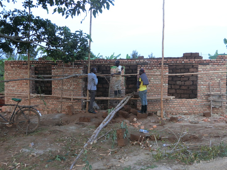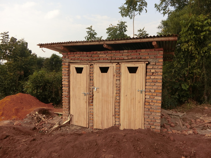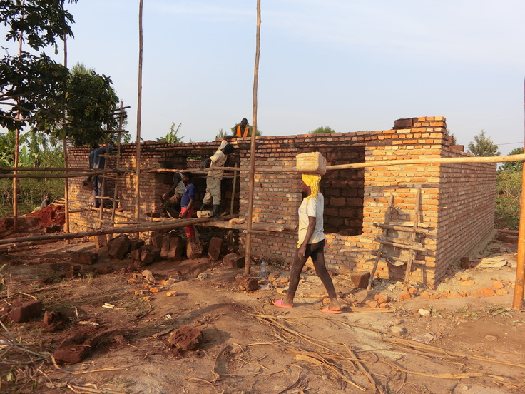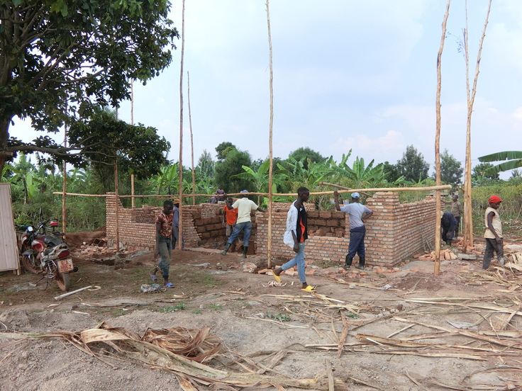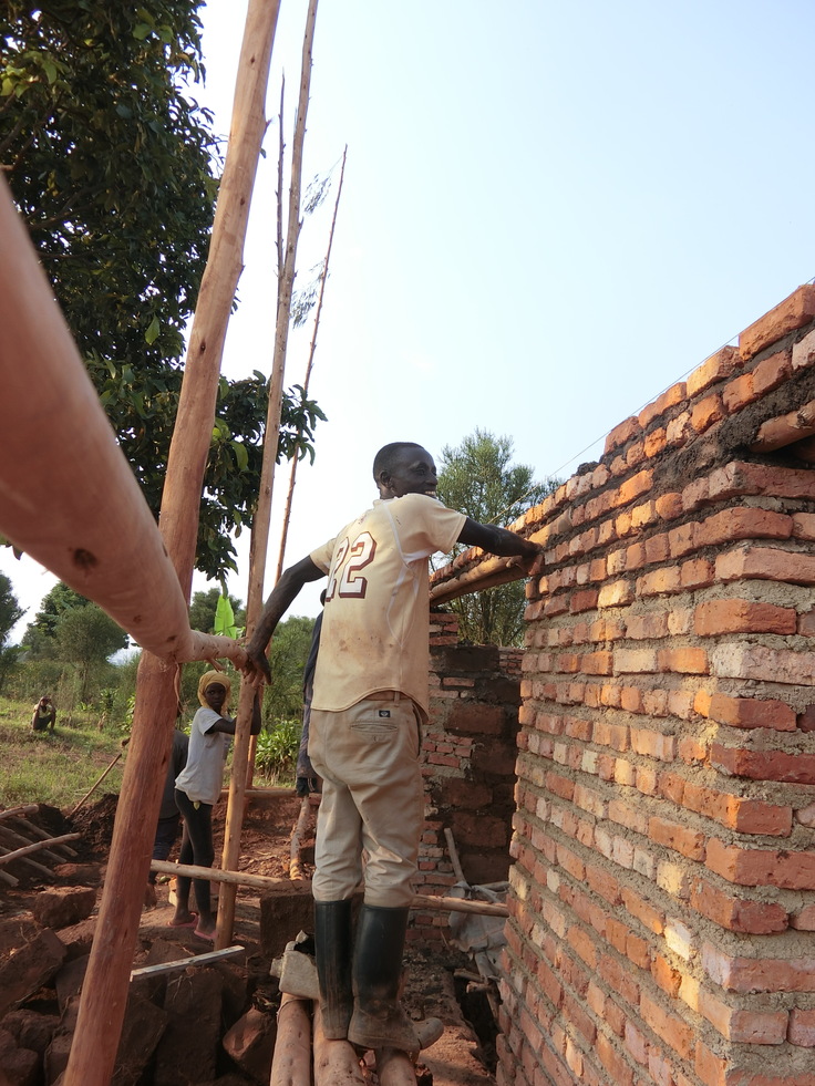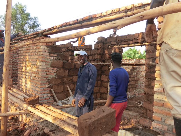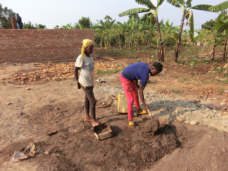 (左)トイレのドアが設置された!合計6部屋(男女各3部屋)。(中央)セメント作りをするKwizeraは英語が堪能でいつも私を気にかけてくれる。(右)セメントを運ぶ女性スタッフ。