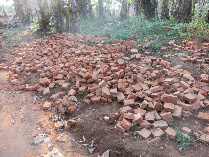 (左)建設チームのリーダーとして活躍するMasudi。とても真面目であまり語らず、当に職人という感じ。(中央)いつも笑わないスタッフが満面の笑みを見せてくれた!(右)壊れた煉瓦。壁には使えないので、床を張る際に使われる。