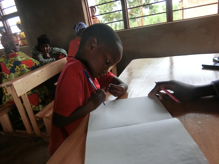 (左)手に障害のある男の子が一生懸命数字を書いた(中央)出席者の自己紹介