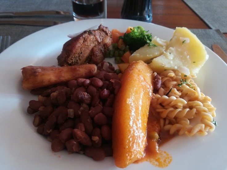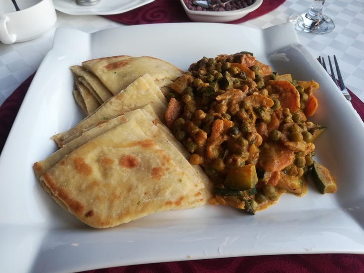 (左)チャパティとベジタブル(グリーンピースと人参の炒めカレー風味) (中央)肉サモサとイフィリティ(フレンチフライ) (右)ビュッフェの一皿