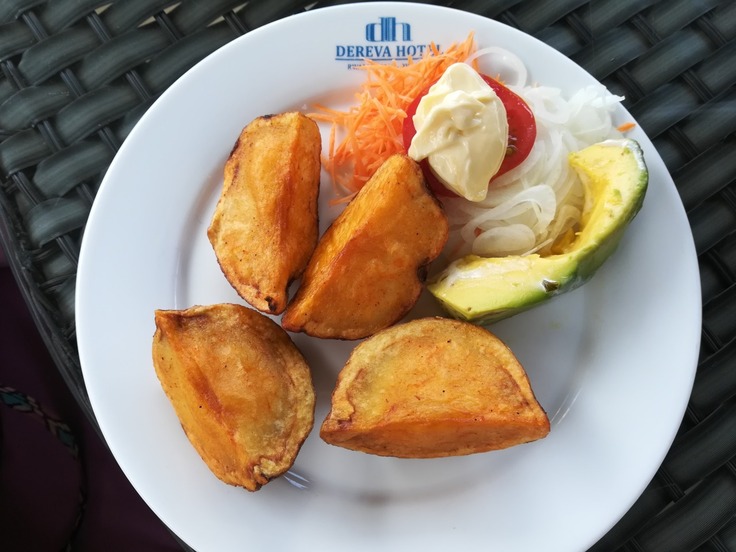(左)「イビリャイ(アイリッシュポテト)」は私の大好物。アボカドも安くて美味しい!(中央)バーでの定番メニュー「ブロシェット(ヤギ肉の串焼き)」と「イフィリティ」 (右)朝食ビュッフェの一皿