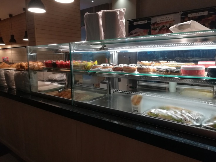 (左)地域に根差したカフェのケース内。パウンドケーキやピザ等、テイクアウトもできる。(中央と右)カフェ「Brioche」はチェーン店で首都を中心に店舗数を増やしている。値段は日本のカフェとあまり変わらない。