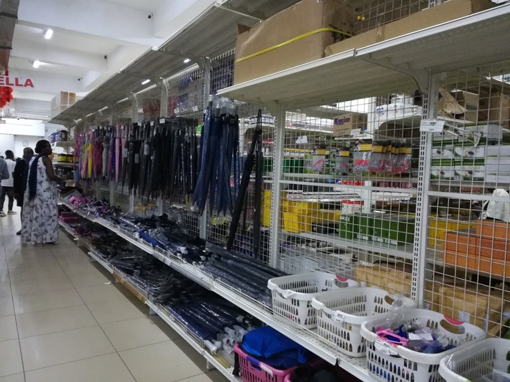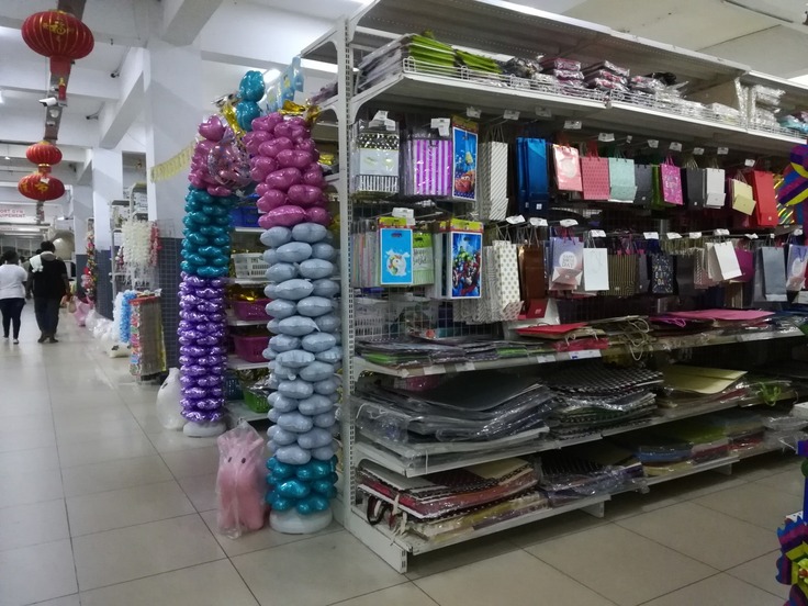 (左)中華系大型スーパー「T2000」内の様子。ギフトラッピング用品やパーティーグッズもある。(右)雨季なので、傘も大量に販売されていた。
