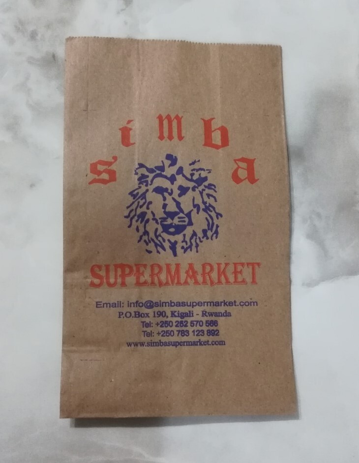 (左・中央)チェーン店の大型スーパー「Simba」では、食料品、日用品、玩具等、ほぼ何でも揃う。(右)ビニール袋が全面禁止のルワンダでは、スーパーで紙袋が提供(または有料で販売)されている。