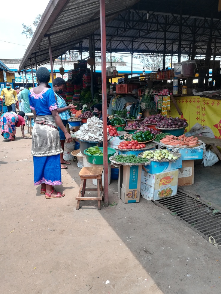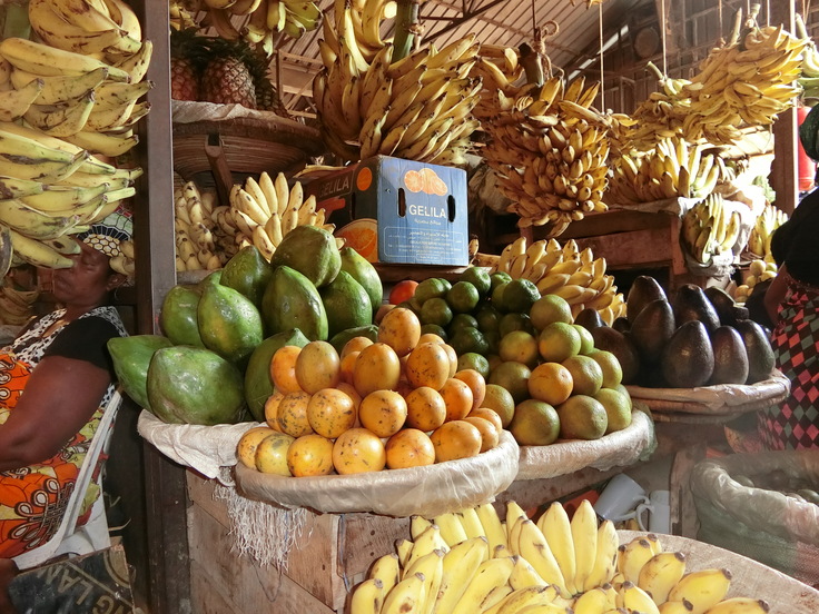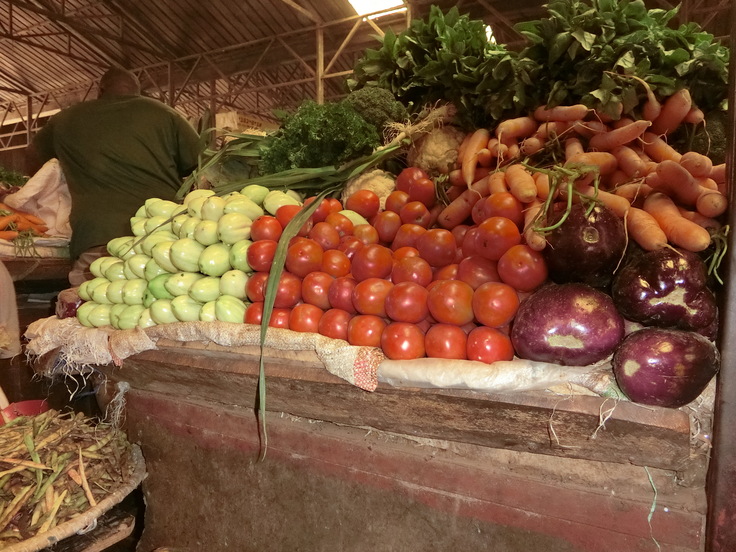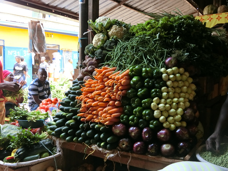 (左)野菜がきれいに積まれている。人参1kg 600~700Frw=90円。(中央)フルーツも美しく盛られている。アボカド(大)500Frw=67円、リンゴ1個 500Frw=67円、バナナ1房 1,000Frw=135円 (右)トマトやナスもある。トマト3個 500Frw=67円、ブロッコリー1個 1,000~1,300Frw=約165円