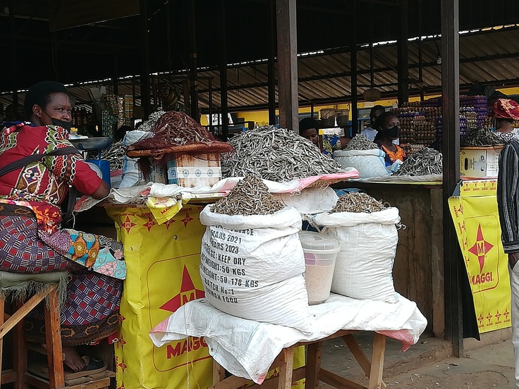(左)干し魚も売られている。(中央)日用品も売られている。(右)野菜やフルーツが色鮮やかに陳列されている。
