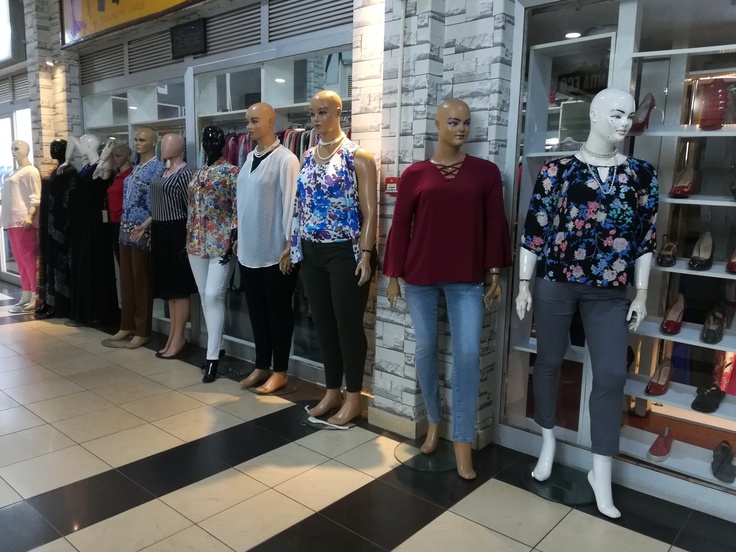 (左)街のショッピングエリアには、洋服屋さん、「アリメンテーション」(軽食やジュース等を販売等が建ち並んでいる。(中央)文具屋さん、パソコンショップ等も並ぶ。(右)ショッピングモール内のマネキンにいつも癒される。