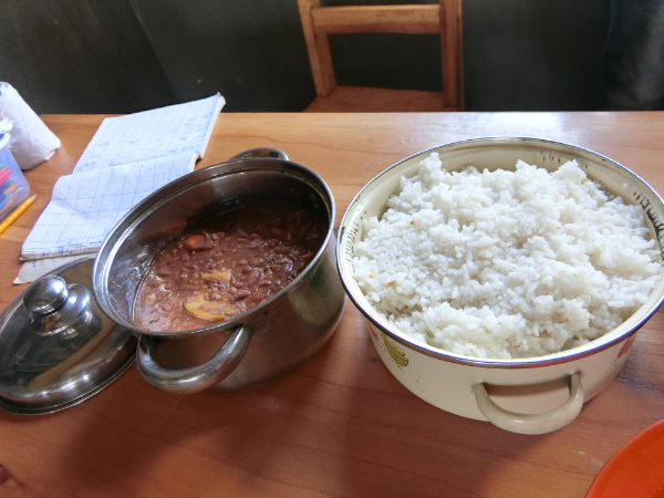 (左)補講授業の様子。ウガンダ人のフラビア先生もキニャルワンダ語レッスンに参加した。(右)先生達のランチ。ご飯に豆とナスの煮込みをかけて食べる。塩だけのシンプルな味つけ。