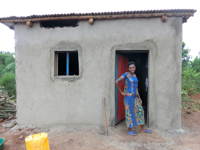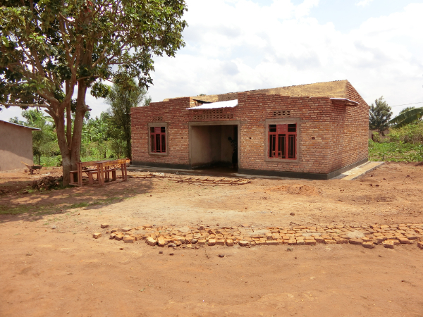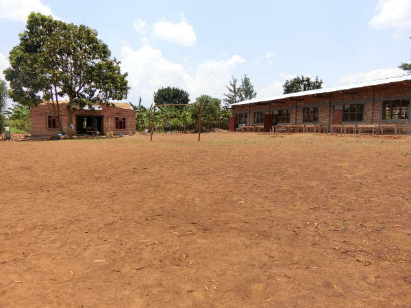 (左)教員室の周囲にはセメントで歩行通路が作られ、内部も床や壁がセメントで仕上げられ、ほぼ完成した。あとは窓ガラスの取り付けのみ。(右)校舎の全体の様子。建設資材であるレンガや石は危険なので、裏に移動され保管されている。