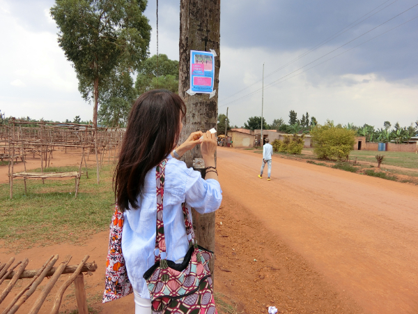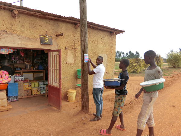 (左)パンフレットを電柱に貼る様子。(右)村の人々も興味津々でパンフレットを読んでくれた!