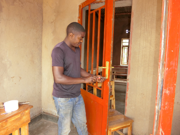 (左)技術者がドアノブを取り付けている様子(中央)取り付けられた窓ガラス(右)この日の先生用ランチ(ジャガイモと豆の煮込み)←味付けは塩のみ。素朴だが芋がホクホクしていて美味しい!