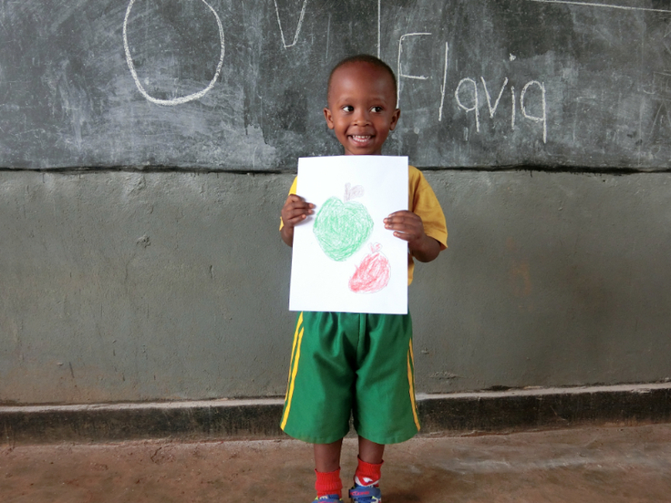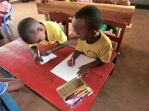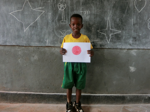 幼稚園の年中クラスと年長クラスの生徒達が、真心込めて、個性豊かな絵を描きました。先生にアドバイスを受けながら、何度も何度も練習して、色とりどりの、世界で一枚の絵が完成しました!