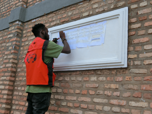 (左)プレートの下地が完成(中央)切り抜いた用紙を貼っている様子(右)貼った用紙の上から文字のペンキを塗る作業