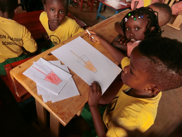 (左)日本の国旗を描いたBrandon君(中央)顔のある花瓶を描いたEllaちゃん(右)2色のリンゴを描いたMiracle君