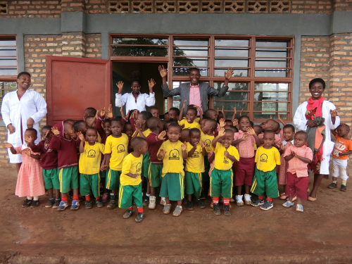 (左)配布前の子ども達。日本からのお届け物に興奮気味