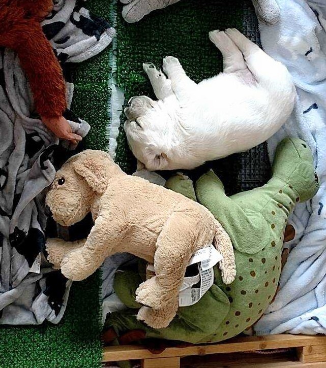 遊び疲れてぐっすり眠るパピー。その横にぬいぐるみ。どちらが本物って思うくらいに一緒の寝相ですね。サポーターの皆様、引き続きのご支援とご声援よろしくお願いします。