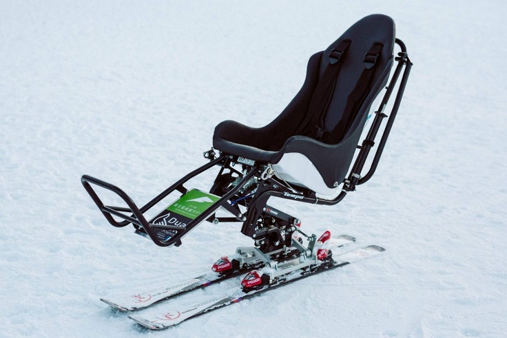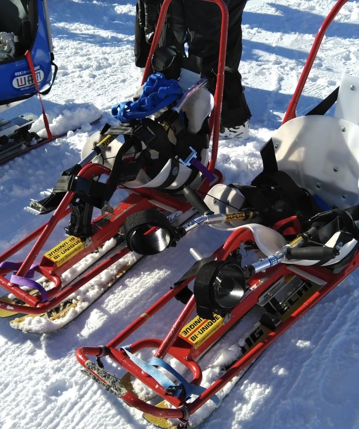 「座ったままで滑ることができるスキー」です。 背もたれ付きのイスの下に2本のスキー板がついていて後ろでもう1人が「パイロット」となり、デュアルスキーを操作しながら滑るというものです。 サスペンションも付いており、限りなくスキーの感覚を近く感じられるようになっています。