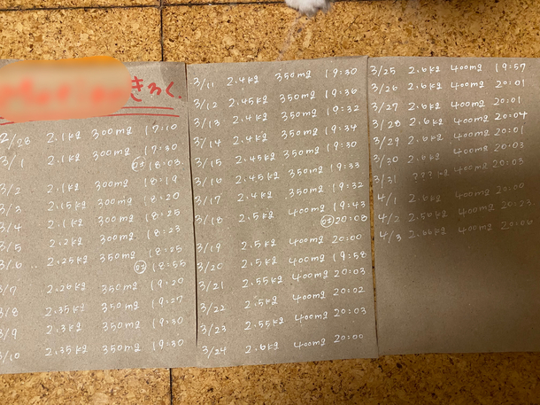 投薬を始めた時に比べるとだんだん体重が増えてきて2.1kgだった体重も2.6まで増えています!途中体重計が壊れて計れなかった時もありましたが順調です🌸🌸