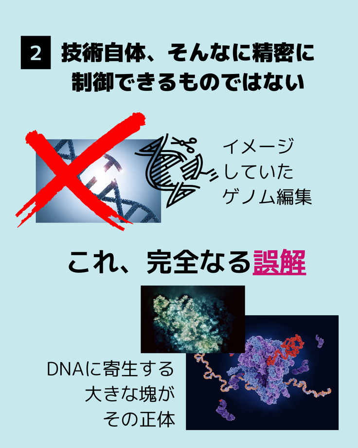ゲノム編集はなんとなくDNAを挟みできるような精密さをイメージしがちですが全く違います。