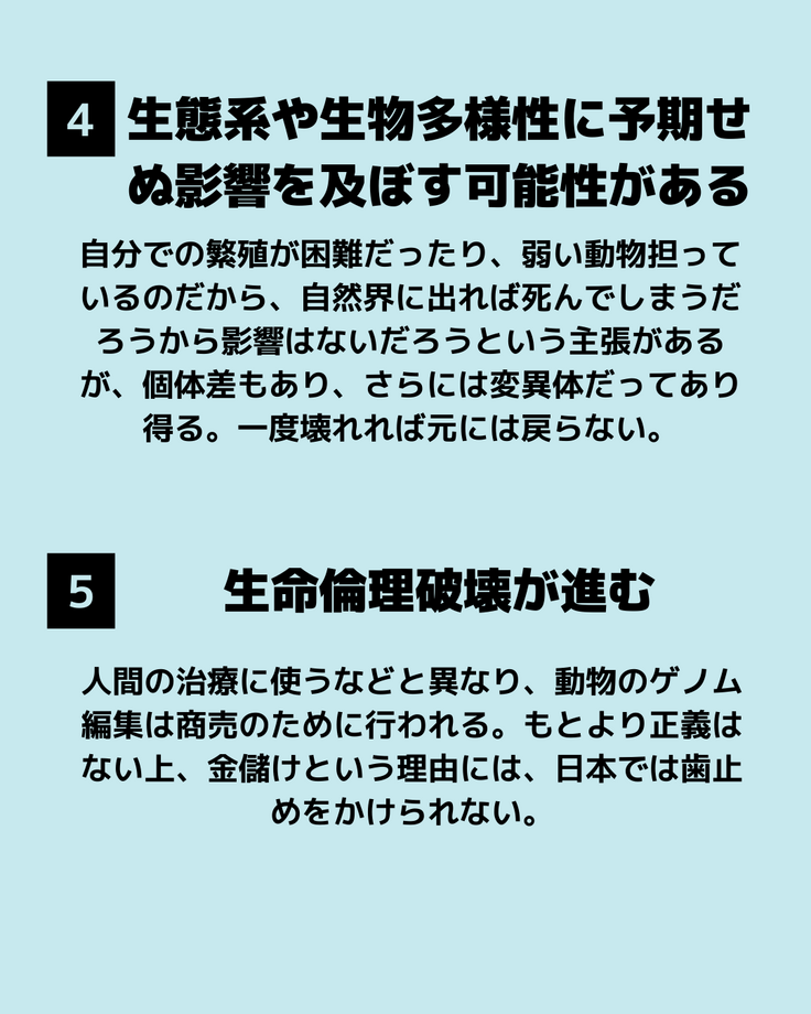 ゲノム編集というと人間の安全性が不安という声が大きいかもしれません。