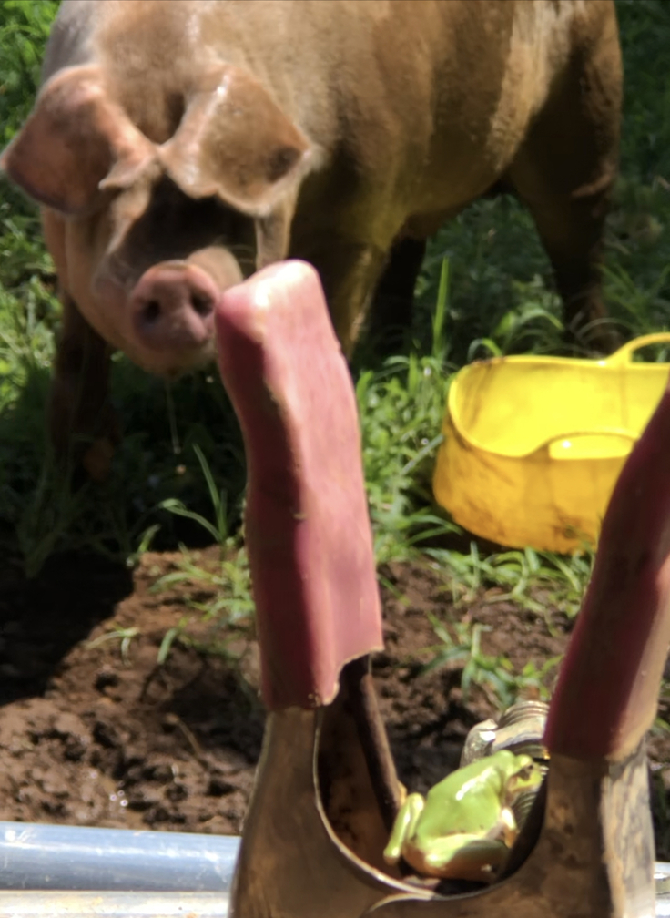 雨が止むと、外は行く子は放牧場に出て行きます。そして水たまりにダイブ。泥のお風呂からでてきたら、今日はアマガエルがいました。