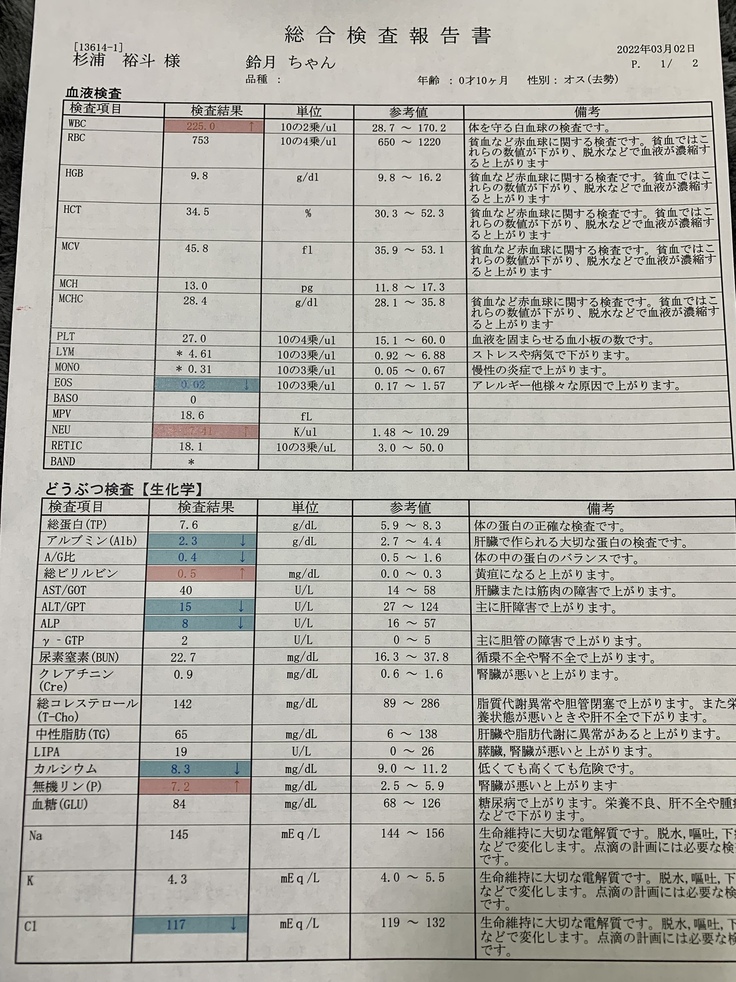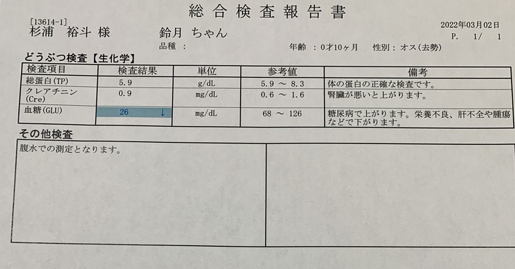 初めは触ると背骨が少し出てる感じがあり違和感を覚えましたが、鈴月自体はとても元気で気のせいぐらいに思っていました。しかし、2週間程経った時少しずつ元気が無くなり、食欲も少しずつ無くなっていき、何かおかしい…と思っていました。それから、背中は痩せているのにお腹だけがぽっこりと膨らみ始めてきました。その異常な体型に不安を感じて3月2日に病院に行きました。