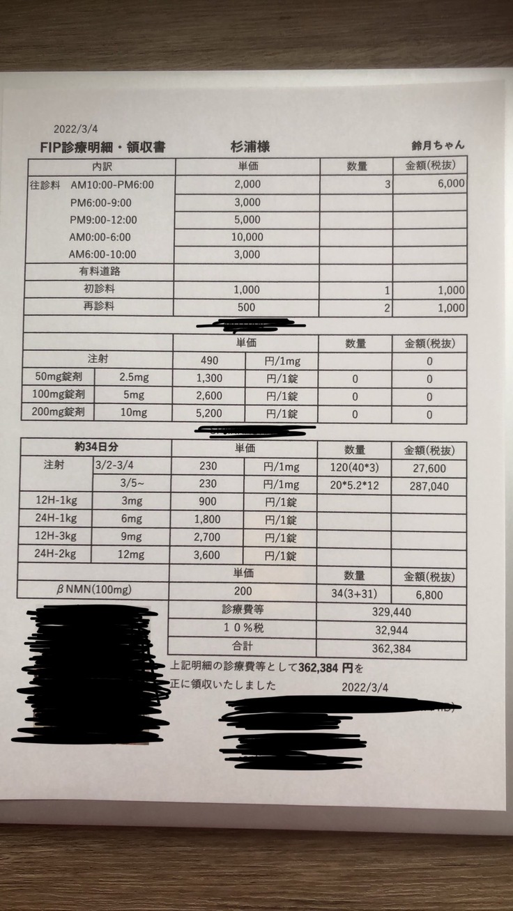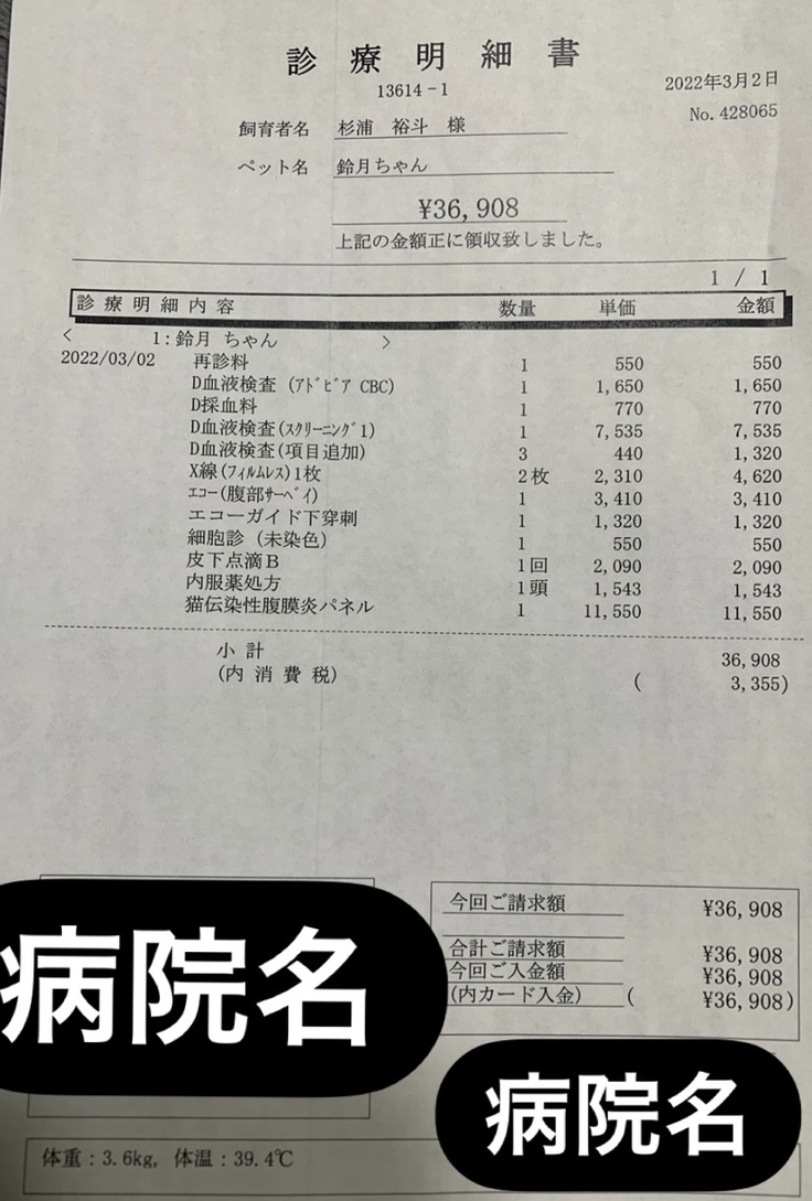 鈴月の治療費についてですが、現在投与している薬の量は鈴月の治療開始の体重をもとに、獣医さんが投与量を決めてくれています。その為、鈴月の体重がこれから増減していくにつれて薬の量も変わってくる為、治療費も多少の増減が今後出てくると考えています。その為正確な治療費を記載する事ができない為、月の平均×3回分で計算しや鈴月の体重増加予想などから、約150万円前後の費用が掛かると獣医さんと私達は予測しております。※鈴月は現在体重が4.5kgまで増加しております。