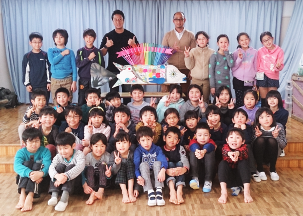 そして、最後に再度、紙芝居で海で起きているネガティブな事実を伝え、ありのままに感じたことをメッセージ(絵や感想、海への想い)に込めてもらい、皆で記念撮影を行っていきます。