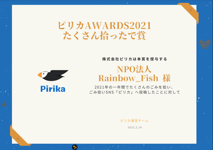 その結果、ゴミ拾いアプリPIRIKA主催による「ピリカAWARDS2021」において「たくさん拾ったで賞」を受賞致しました。