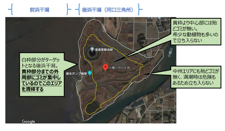 その結果、盤洲干潟の中でも後浜干潟(河口三角州)の外周部分により多くのゴミが密集していることが判明しました。