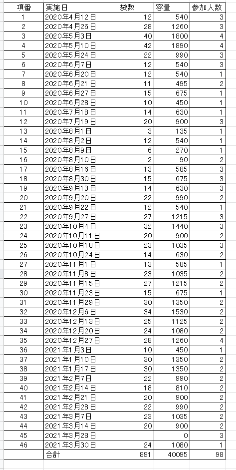 ゴミの量は事前調査により多摩川河口干潟の時と同等程度と見ており、45㍑袋で1000~1300袋程度と考えらますので、当面の目標として60,000㍑=1,334袋を本プロジェクトのゴールに設定したいと思います。