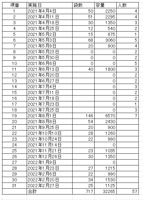 清掃活動は2022年2月末時点で通算175回を実施し、拾ったゴミの総量は234,061㍑(45㍑ゴミ袋で5,201袋分)になります。