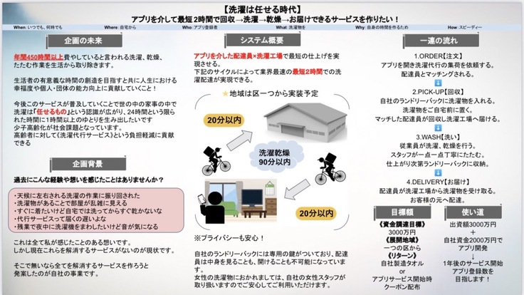 - 洗濯代行を行う際にクリーニング行法により、国家資格であるクリーニング師の資格保持者を営業所に1人以上設置しなくてはなりません。 アプリ開始により多くの洗濯物を取り扱いますので、クリーニング師の雇用を10名ほど行います。 私自身もクリーニング師の資格を2022年12月まで取得予定です。 株式会社設立予定ではありますが、代表の村上俊輔も12月までのクリーニング師資格取得予定であります。