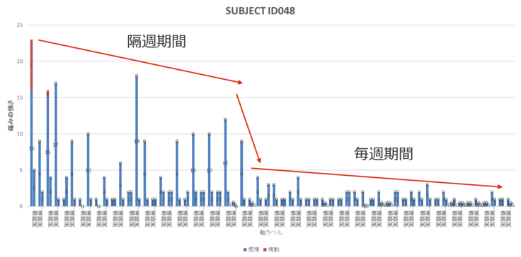 ※幻肢痛交流会に参加する方に訓練開始前・後に痛みの状況を確認するデータを取っており、隔週実施から毎週実施へと変わった際の時系列グラフです(こちらは顕著に痛みが軽減された方のデータです)