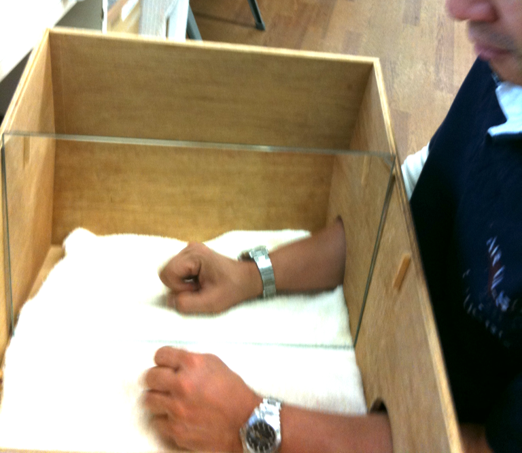 調べてみると、特効薬はなく難治性であること、唯一、鏡を使った治療法があるということを知りました。鏡療法は、体の真ん中に鏡を置き残存肢(動く方の腕)を鏡越しに見て、鏡に映った腕の動きと幻肢を重ねます。そうすることで、自分で腕を動かせている「運動の錯覚」を得ることで痛みが緩和するというものですが、これまでの臨床研究からいくつかの限界点があることも指摘されています※。
