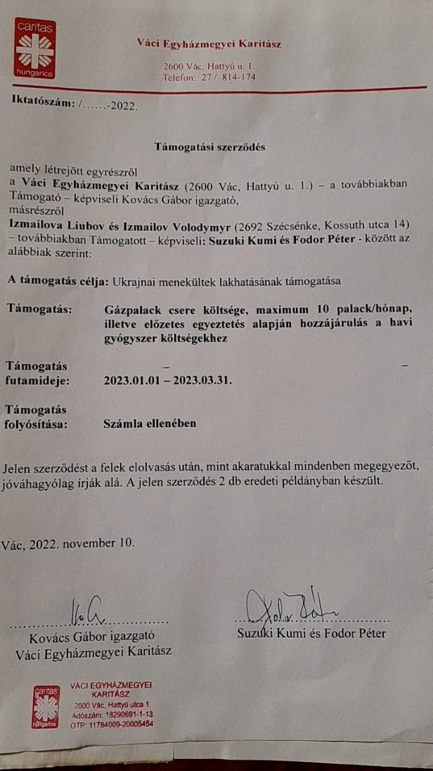 「通常、長期住宅提供は3ケ月までですが、ご夫婦はハンガリーで働くこともできないし、ウクライナでの年金はわずか70ユーロ(月にして約1万円)。今の物価高のハンガリーでは、5日間の食事代ぐらいがご夫婦の年金額です。ここまで長期の無償の住宅提供と、その他の食事そして生活品においても支援していただき、心から感謝申し上げます。」