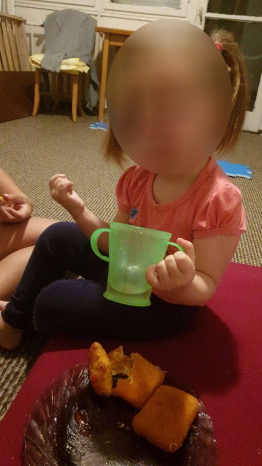 上記写真(ジャムが入ったアニャ(ママ)の手作りのおやつを食べていました)