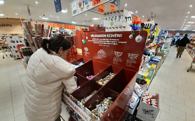 この日、ショツプの室内には、貧困家庭の方たちがいろいろな物資を受け取りに来ていました。スタッフにお声かけし入口の手前に、チョコ約10キロ分を置いて帰りました。カリタスショップへの、ウクライナ難民や貧困の子どもたちへのチョコレート支援におきましては、レディーフォーでのプロジェクト支援金と募金箱のご支援金の一部を合わせて支援させていただきました。