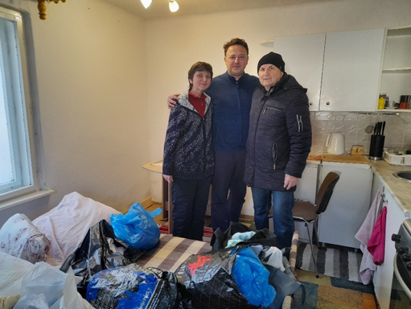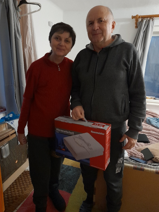 めまいもだんだんと良くなり、先月に比べると明ら かに体調のコンディションが良さそうな、ルパさんの表情からそう思うことができまし た。 ウクライナはハンガリーよりもさらに寒い国なので、ドニプロの自宅に帰ってから寒いと 大変な思いをされると心配でした。車のバッテリーでは部屋の気温がどこまで上がるかの かも分かりません。ルバさんに「プロジェクトのご支援金で支援させていただいた電気毛 布もドニプロで使ってください。」と提供させていただきました。また、ウラジミールさ んにも電気毛布をプロジェクトから支援させていただきました。