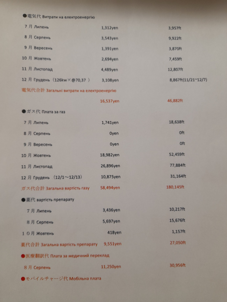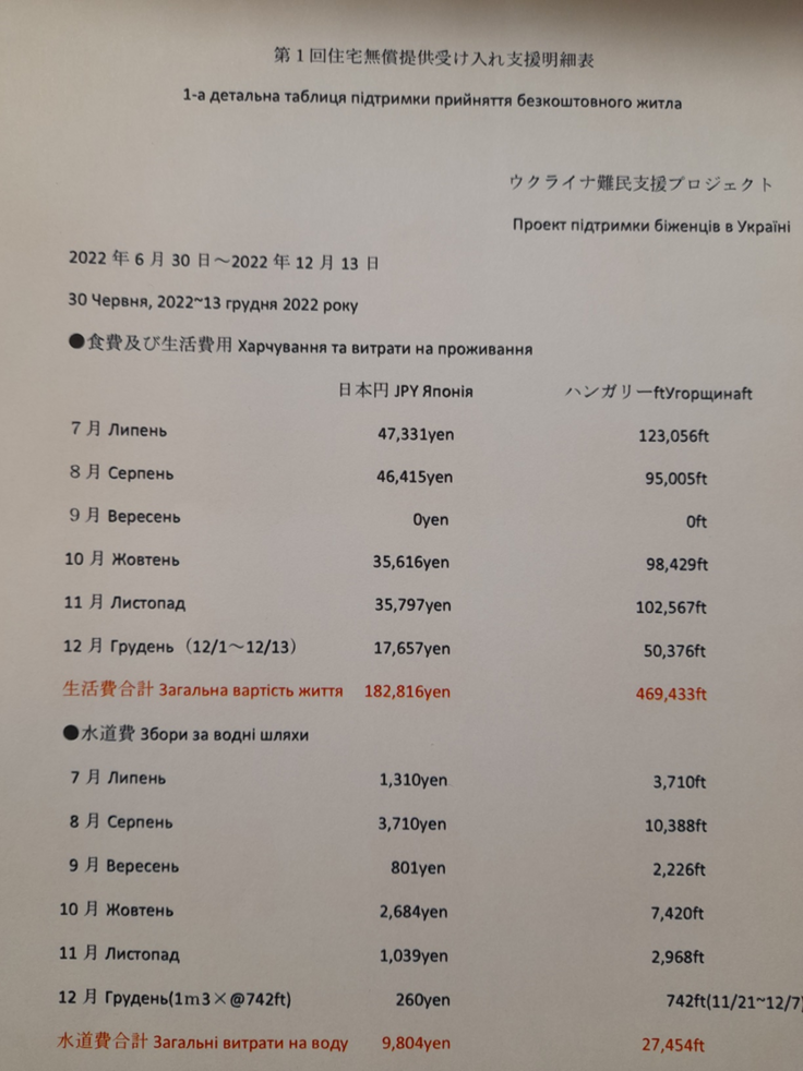 11 月、ルバさんの体調が思わしくない状態が続いてる中、いつも通り月末(30 日)に、翌 月の生活費をお渡しするため部屋を伺いましたら「私たち 12 月にドニプロへ帰る決意をし ました。このままの状態でここに残っても精神的に限界がきてしまい、どうしても家に帰り たい。このような爆撃の中でも自分の家に帰った方がルバの精神的な苦悩が少し落ち着く のではないか。それと金銭面でも来月からは生活費がプロジェクトより出ないとなると私 たちはハンガリーでは住めない。いくらカリタス団体からガス代の支援やプロジェクトか ら多少の支援があっても、私たちふたりのウクライナの年金だけではハンガリーでは生活 ができない。いろいろなことを考えてこの決断をしました。もちろんドニプロへ帰れば爆撃 の心配はあります。でももう限界なのです。」と伝えられました。
