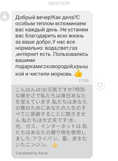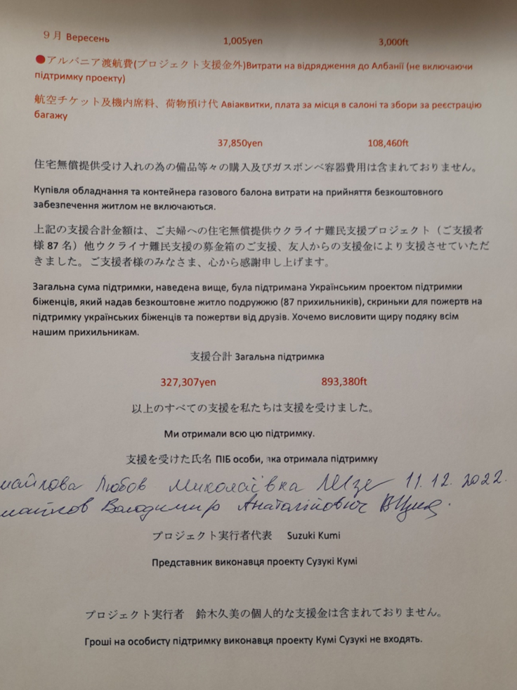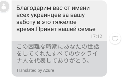 日本のご支援者の皆様、私たちは忘れません。あなた方に出会えて良かったです。すべて に感謝します。そしてウクライナ人代表として、たくさんのウクライナ人を救ってくれて ありがとう。心優しい人たちに出会えて私たちの宝です。