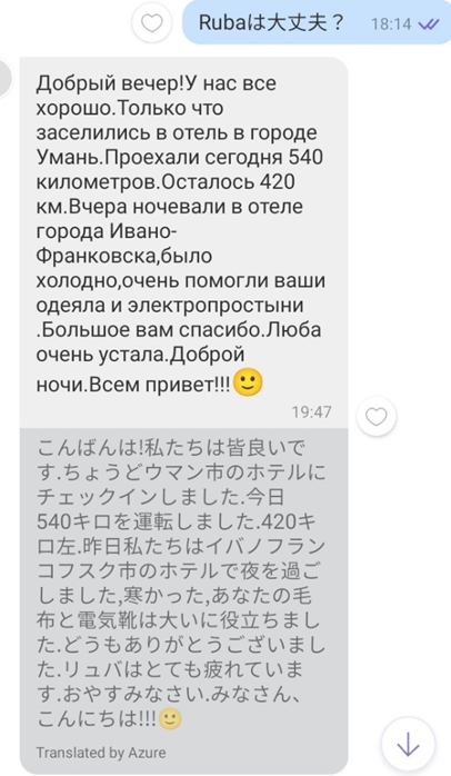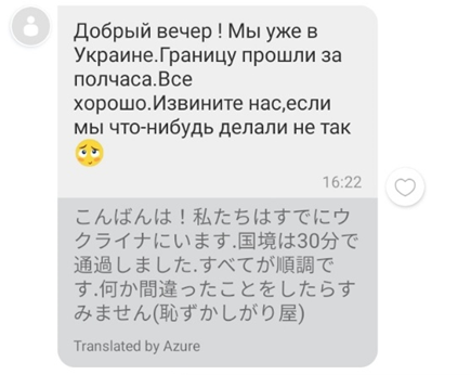 以下の Viber でのメッセージなど、ウラジミールさんに承諾のもと公表しております。 帰還当日の AM10 時、無事にドニプロの家にたどり着けるか不安な気持ちのまま夫と見送 りました。その後、国境超えてからメールをいただきました。