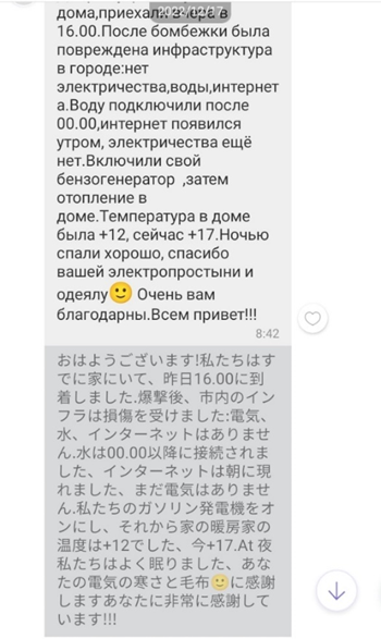 やはり、ドニプロはインフラ損傷で、自宅は電気、水、インターネットはない、発電機(車 のバッテリー)で部屋の電気を使用と書かれています。