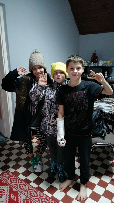 日頃より Viber 翻訳機能を使って会話をしている中で、タニエさんが 12 月に入り仕事が 長引き、子ども3人で留守番していることが多い、と聞き、車で1時間 30 分の Nagymaros(ナジマロッシュ)へ、わずかな時間でも顔を出して様子を伺いにいきまし た。