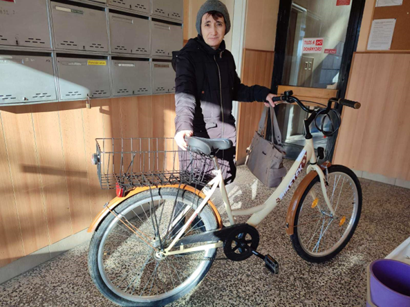 以前の報告書で掲載しましたが、ウクライナの家を失ったエリカさん家族。 エリカさんは、掛け持ちで掃除の仕事をされています。通勤手段として遠いバス停まで徒 歩で通っており、胸にはペースメーカーが入っていて通勤するにも体が大変な上に、心身 ともに毎日のご苦労があり一時はお仕事を休んでいました。エリカさんの通勤手段として、 また、重い荷物の買い物などにも自転車を利用してほしいとの思いで、自転車の支援をさ せて頂きました。現在の市営住宅の家賃と光熱費は、カリタス支援団体が全額負担してお ります。 私たちは、本プロジェクトと募金箱からのご支援金より、月に日本円約 10,000 円の生活費(半年間)を支援させていただくことに(現時点でのエリカさんとの話し合いで) いたしました。