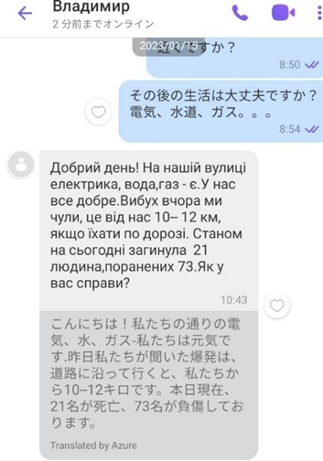 ニュースを見て心配になり、ウラジミールさんにメールをしましたところ、ルバさんご夫 婦の住まいは被害がなく無事とのこと。別メールでは、家の中の比較的厚い壁付近に身を 寄せている、という旨のメール連絡を受けました。