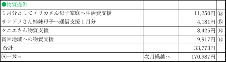 上記の月次書に計上されていない1月のご支援金につきましては、三重県四日市市内の各 企業様、四日市教会からの募金箱でのご支援金で支援させていただきました。
